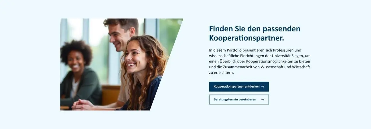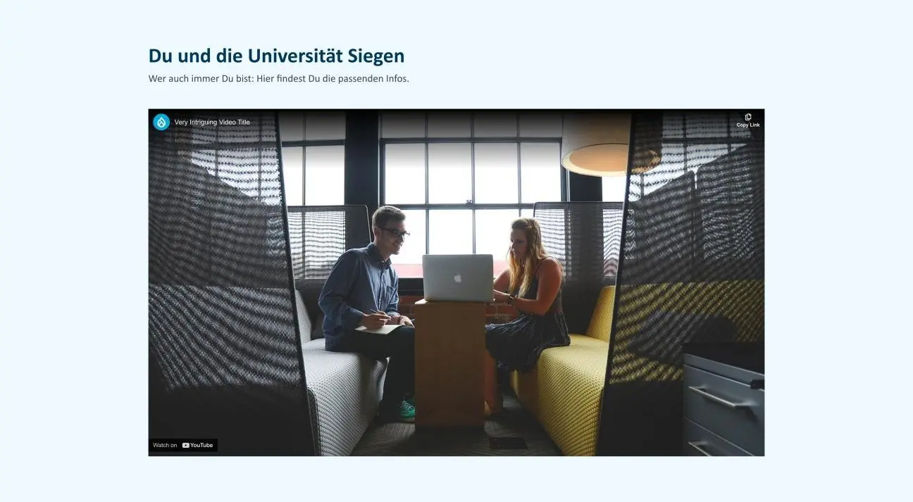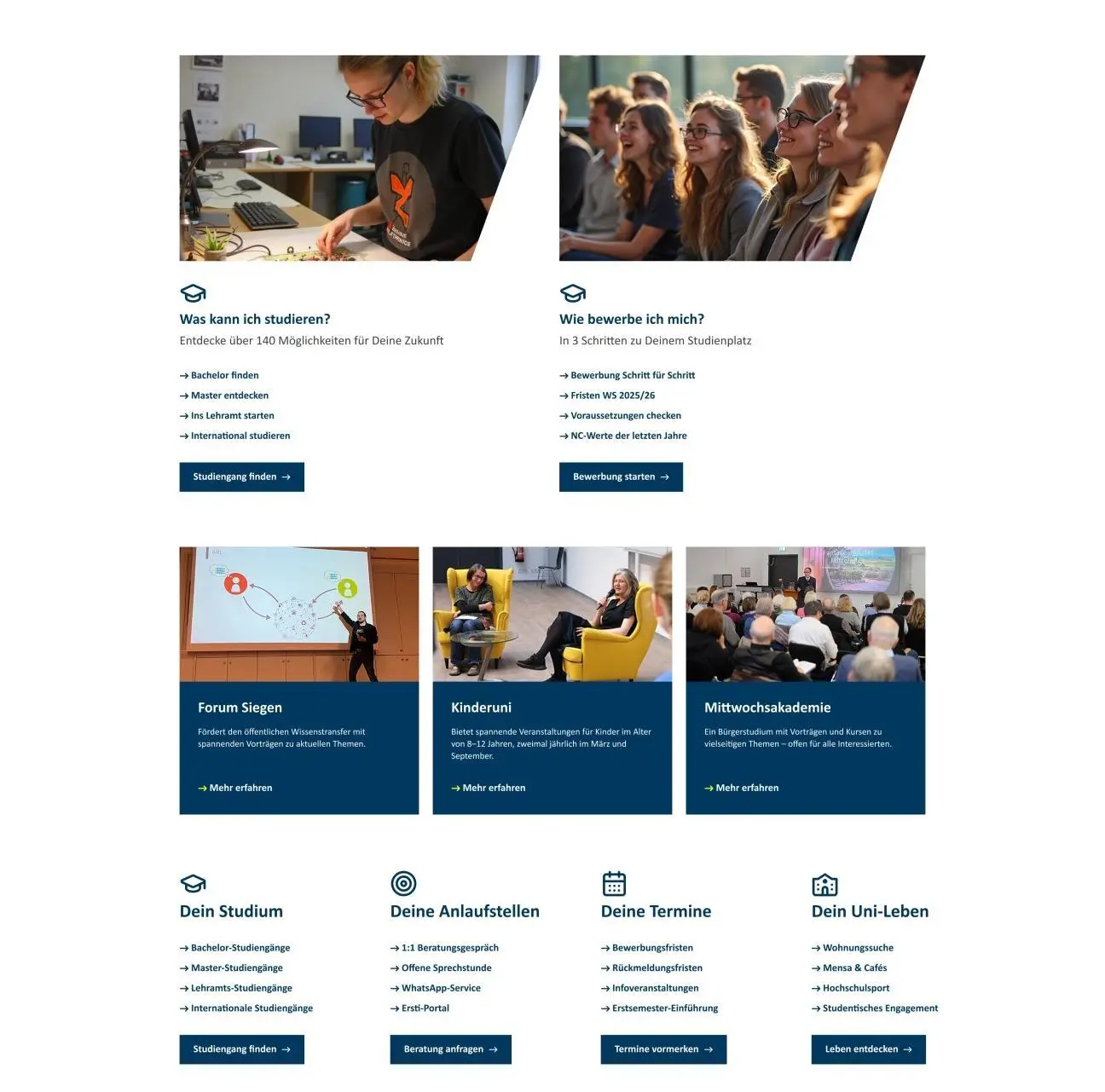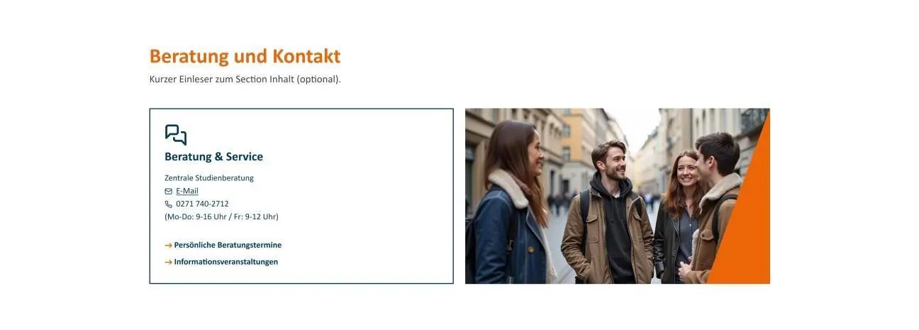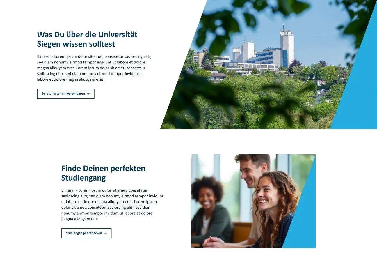 | Testimonials | Erfahrungsberichte von Personen (Studium, Universität), inkl. Foto, Name und Position |