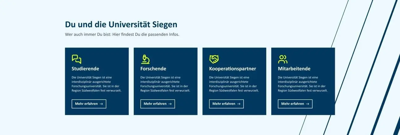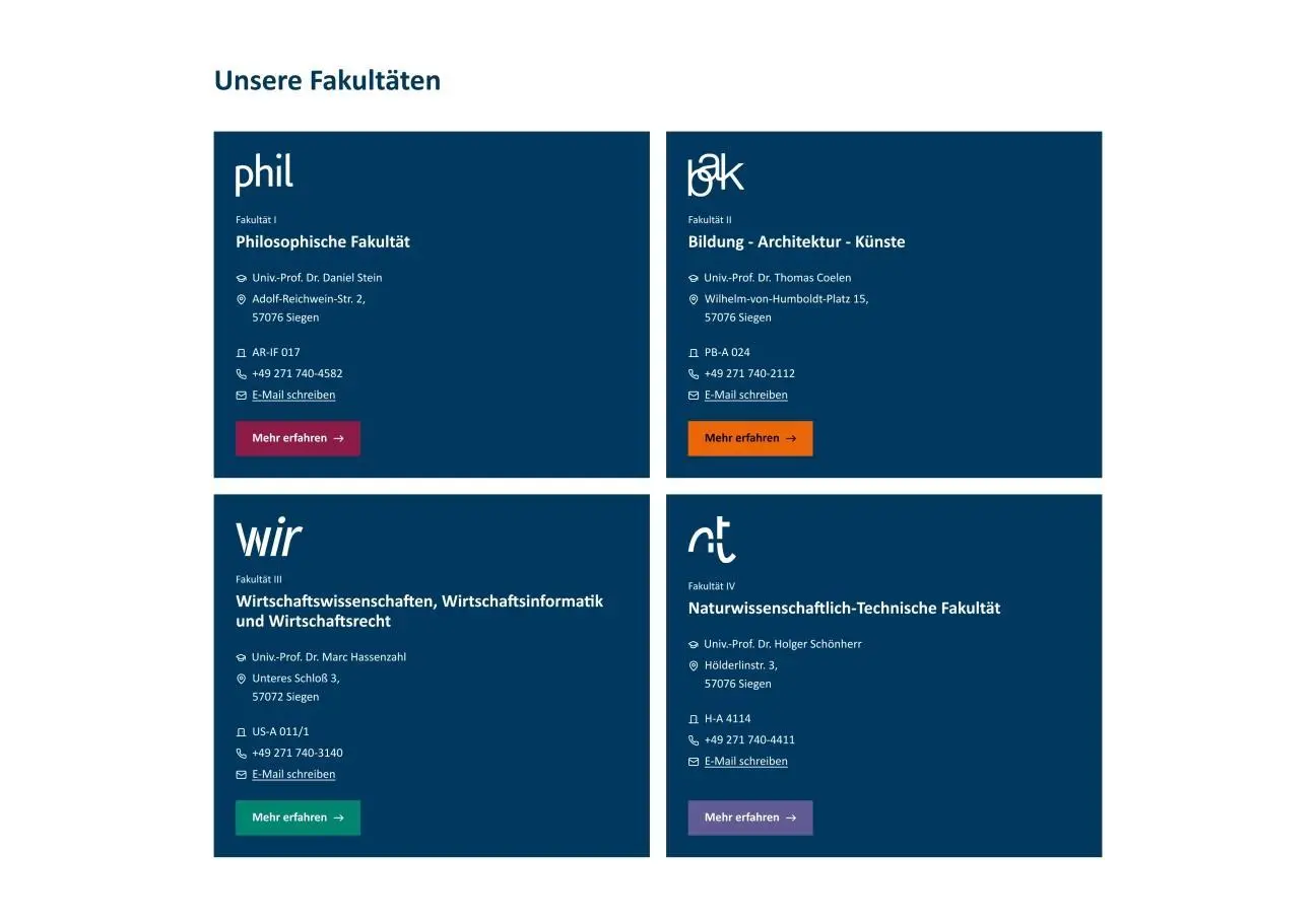 | Faculty Cards | Kacheln mit Informationen zu Fakultäten |