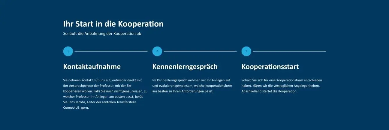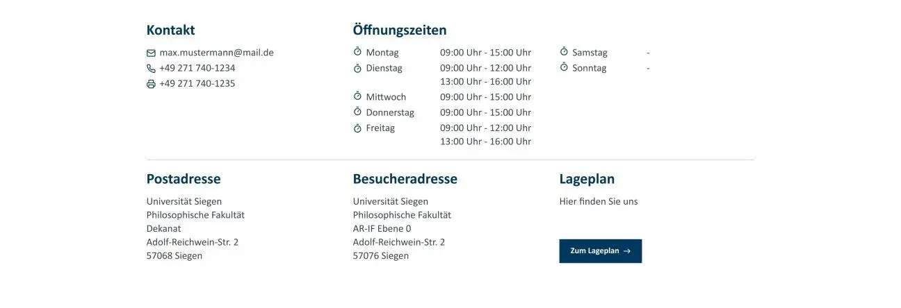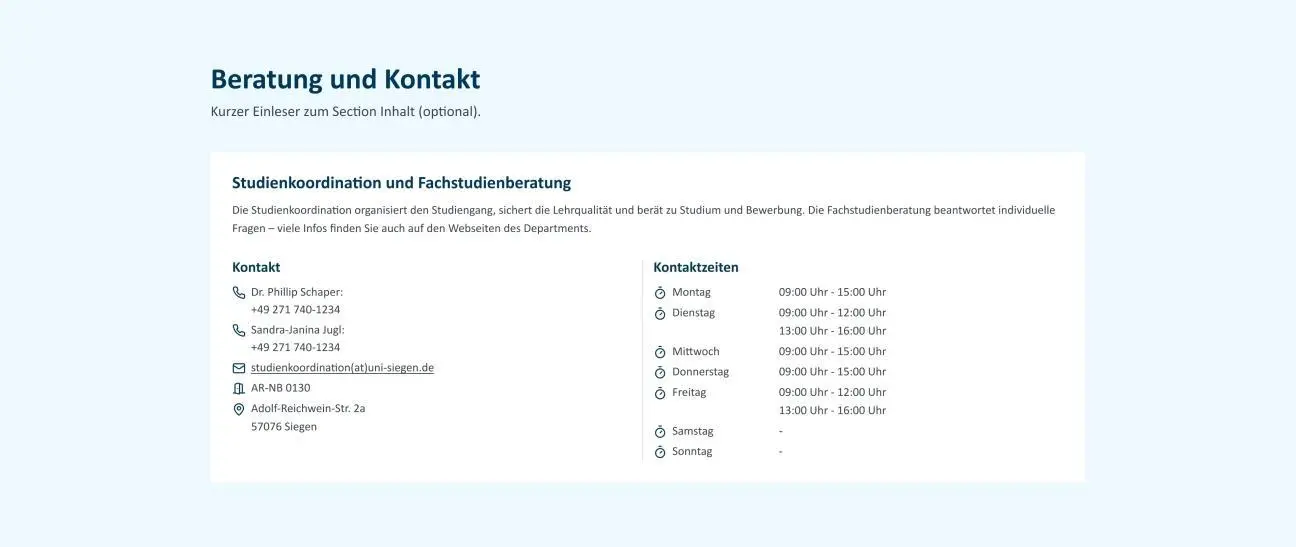 | Contact Details | Detaillierte Kontaktdaten mit Zeiten zur Erreichbarkeit, Telefon, E-Mail, Adresse (Post- und Besucheradresse), etc. und Link zur Kontaktseite/Lageplan |