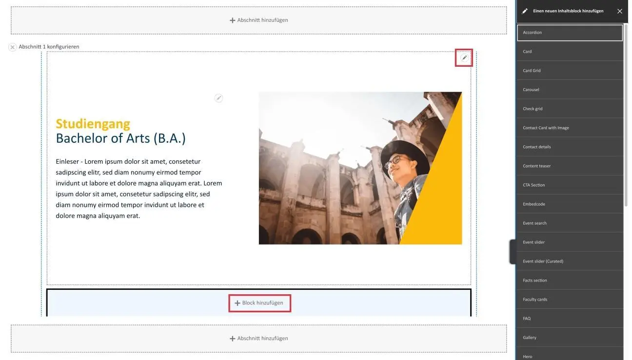 Nach dem Hinzufügen eines Blocks haben Sie die Möglichkeit, diesen zu konfigurieren. Wenn Sie den Block nachträglich bearbeiten möchten, fahren Sie einfach mit der Maus über den Block. Es erscheint ein Kontext-Menü mit einem Stift-Button oben rechts im Block. Klicken Sie auf den Stift, um die Konfiguration des Blocks zu öffnen und anzupassen.