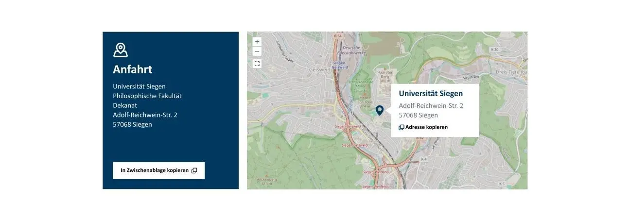 Die Kontaktdaten-Karte kann zur Darstellung von detaillierten Kontaktinformationen einer oder mehrerer Institutionen, Einrichtungen, Dienstleistungen, etc. genutzt werden.