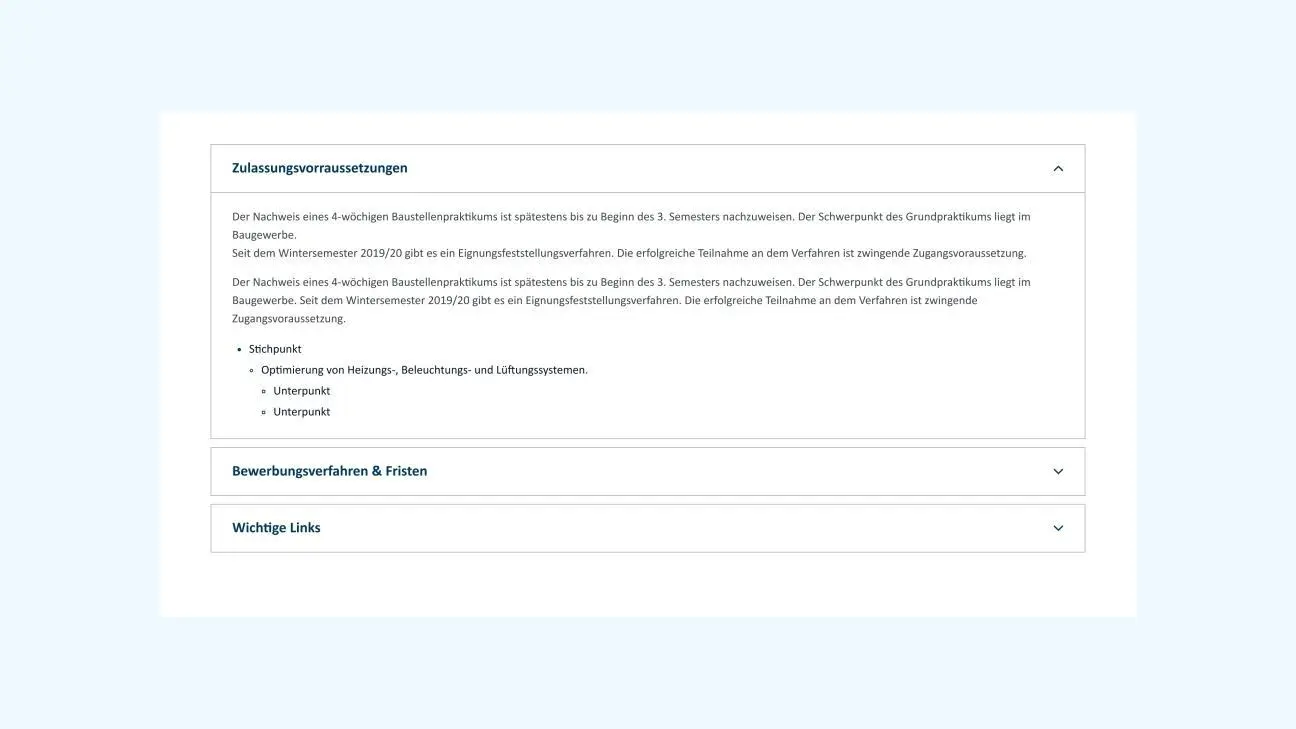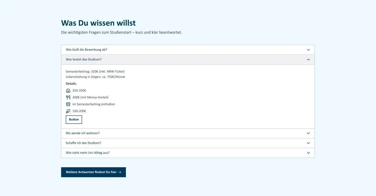 Ein aufklappbarer Bereich, mit dem sich längere Textsegmente ein- und ausblenden lassen. Besonders geeignet für FAQs, Anleitungen oder weiterführende Informationen, um eine kompakte Seitendarstellung zu ermöglichen.