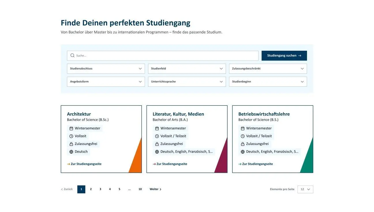 | Study Programs | Liste aller Studiengänge mit Filtermöglichkeit |