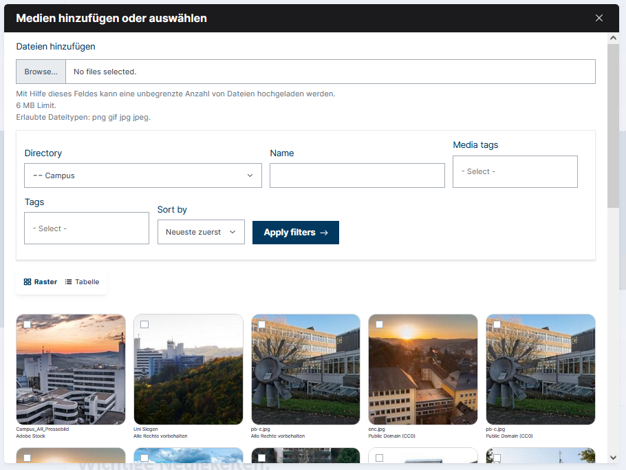 Wenn ein Bild nicht neu hochgeladen, sondern aus der bestehenden Mediathek ausgewählt werden soll, können Sie die vorhandenen Bilder durchsuchen und filtern.
