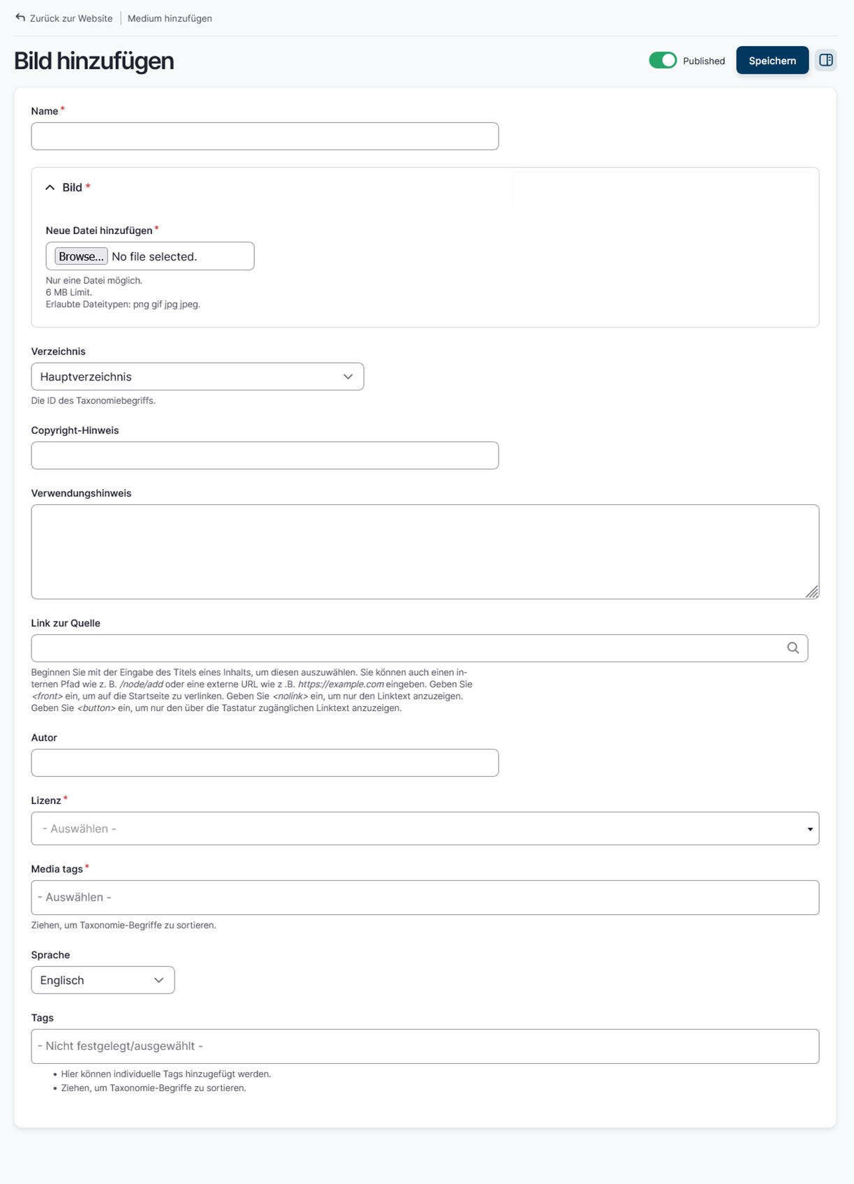 Beim Anlegen eines neuen Bildes in Drupal müssen verschiedene Felder ausgefüllt und geprüft werden. Diese Felder dienen der strukturierten Ablage, der rechtlichen Absicherung sowie der barrierefreien und inhaltlich korrekten Darstellung des Mediums auf der Website. Eine sorgfältige Pflege der Angaben stellt sicher, dass Bilder später leicht auffindbar sind und den geltenden Qualitäts- und Nutzungsanforderungen entsprechen.