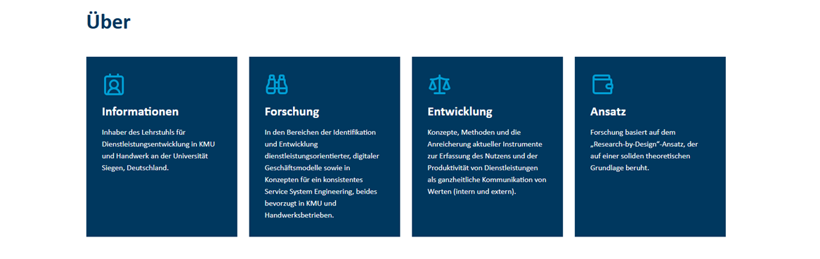 Eine Service-Übersicht dient dazu, eine Einrichtung oder ein bestimmtes Angebot auf einer Webseite übersichtlich darzustellen. Besucher*innen sollen auf einen Blick verstehen: Was wird hier angeboten? Wer steckt dahinter? Und wo bekomme ich weitere Informationen oder Unterstützung?